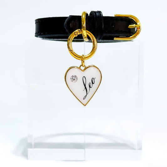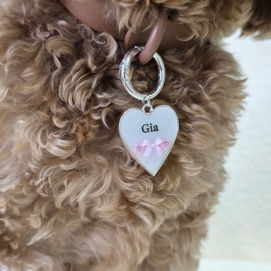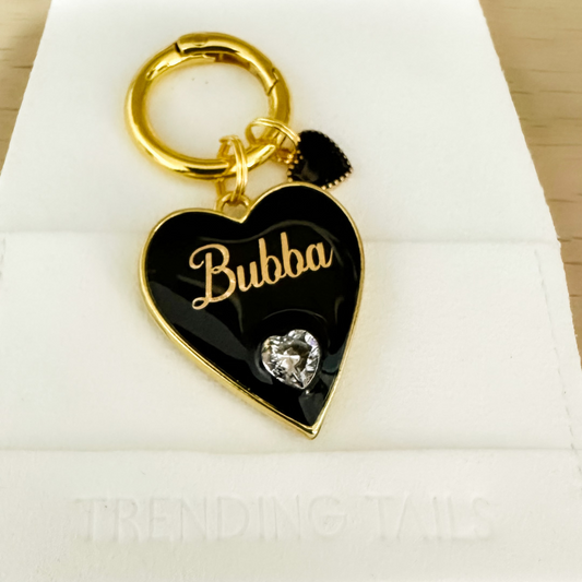 The ultimate pet ID tag that is sure to turn heads and keep your furry friend safe at the same time. Our luxurious heart-shaped tag is handmade from high-quality resin and Features AAAAA-grade cubic zirconia stones in a heart shape, this piece sparkles to the max!